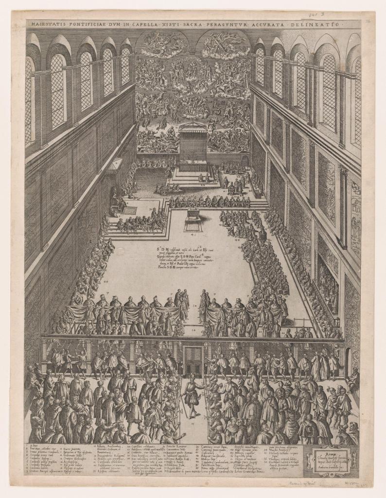 Title: Speculum Romanae Magnificentiae: A Papal Gathering in the Sistine Chapel, Michelangelo’s Last Judgement on the back wall; the crowd looks on through a screen